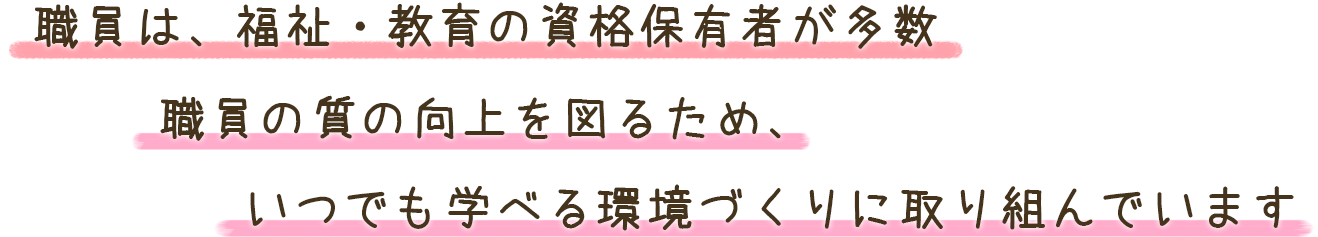 保育士、幼稚園教諭、言語聴覚士、作業療法士など福祉や教育分野の有資格者を多く採用しています。職員の配置人数は法定基準よりも多くお子様2名に対して職員を1~2名配置しており、お子様に合わせて個別対応ができるよう配慮しております。
